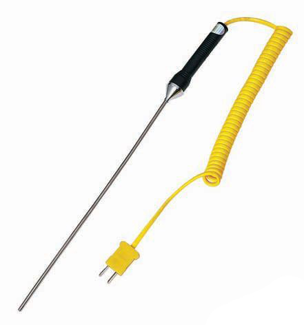 手柄式熱電偶又稱手持式熱電偶專供測量各種形狀的固體介質的表面溫度以及測量液體、氣體的溫度。手柄式熱電偶使用范圍很廣,不受物體表面的形狀限制,外形輕巧,攜帶方便,由于手柄式熱電偶具有直徑小、可彎曲、抗震動、熱響應時間快和緊固耐用、可靠性高等優點,該產品與數字顯示儀配合使用可直接測量并顯示不同生產過程中0~1200℃范圍內的各種介質的溫度,被廣泛用于冶金、化工、紡織、印染、造紙、橡膠、塑料、陶瓷、糧倉等工業部門、企業。